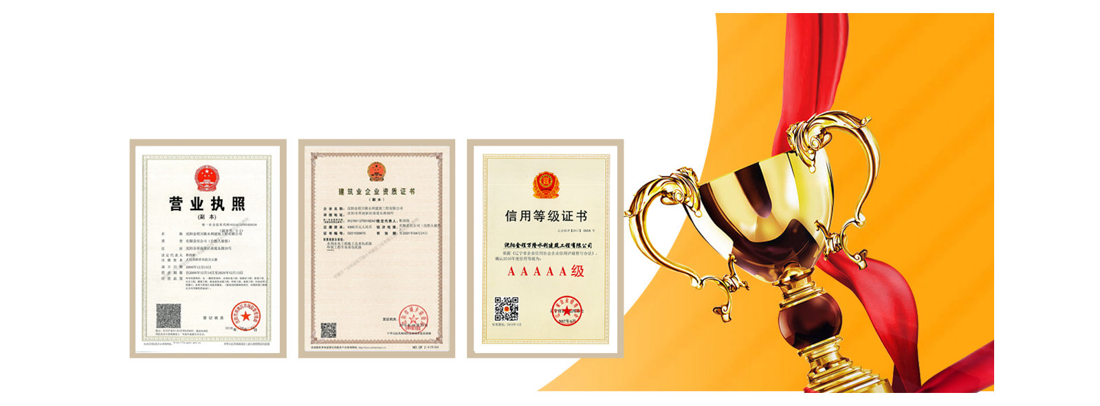 我公司先后受到遼寧省建筑業協會的好評,遼寧省及沈陽市工商局頒發的重合同守信譽企業稱號,勞動保障監察書面誠信等級A,信用遼寧網站公示AAA等級,信用沈陽網站公示AAA等級,水利安全生產標準化二級單位,中國水利工程協會信用AAA等級,